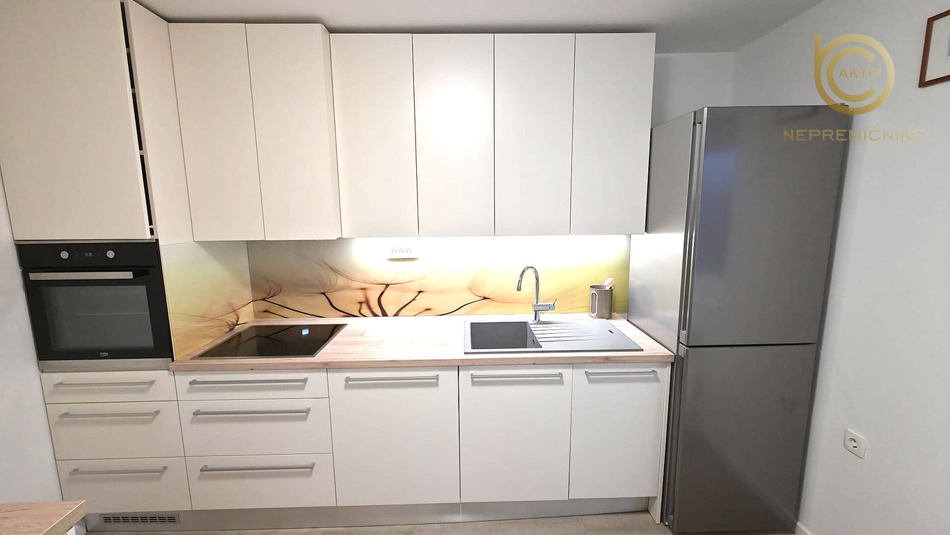 Kuhinja je opremljena s kuhinjskim pohištvom in belo tehniko (indukcijska kuhalna plošča, pečica, napa, pomivalni stroj, pralni stroj, hladilnik z zamrzovalnikom, mikrovalovna pečica, korito s pipo).