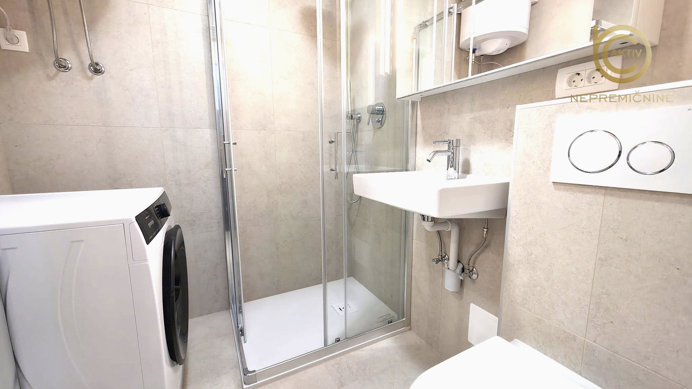 Kopalnica z WC-jem je opremljena s kabino za prhanje, umivalnikom, ogledalom, sušilnim strojem, bojlerjem in školjko.