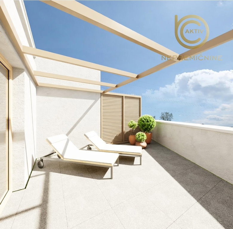 Stanovanje ima lastni vhod in je zasnovano v treh etažah: pritličje, 1. nadstropje in 2. nadstropje. Stanovanju pripadajo atrij, dve terasi, dve parkirni mesti s predpripravo za električno polnilnico ter skupna kolesarnica.