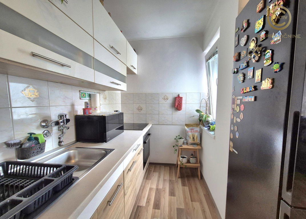 Kuhinja je opremljena z vgradnim kuhinjskim pohištvom in belo tehniko (steklokeramična plošča, hladilnik z zamrzovalnikom, pečica).