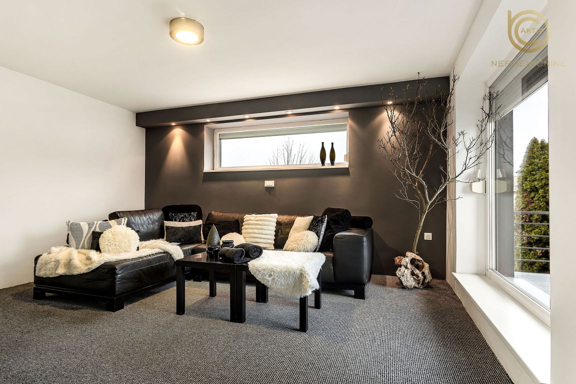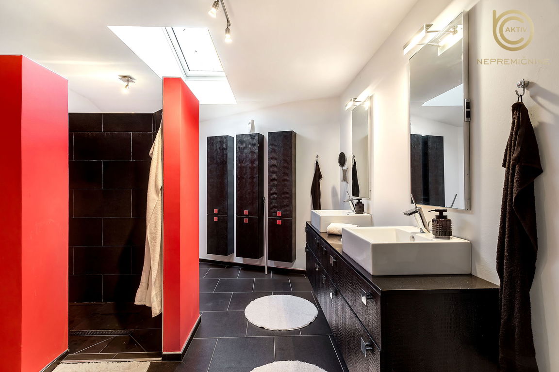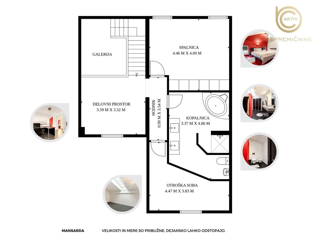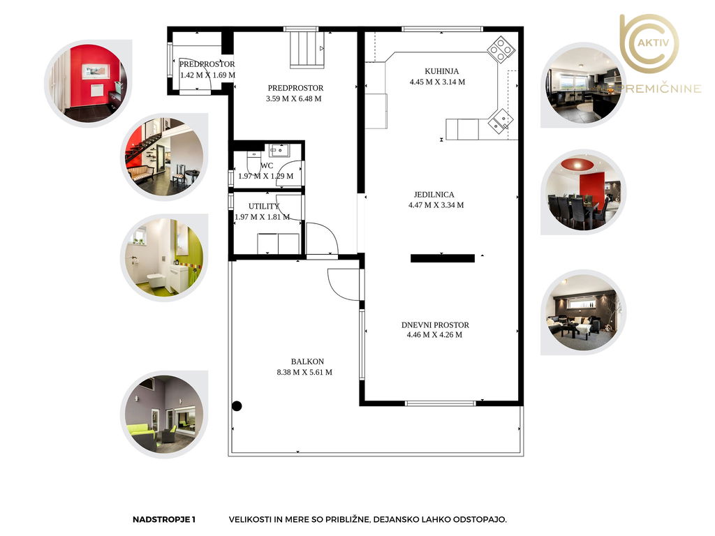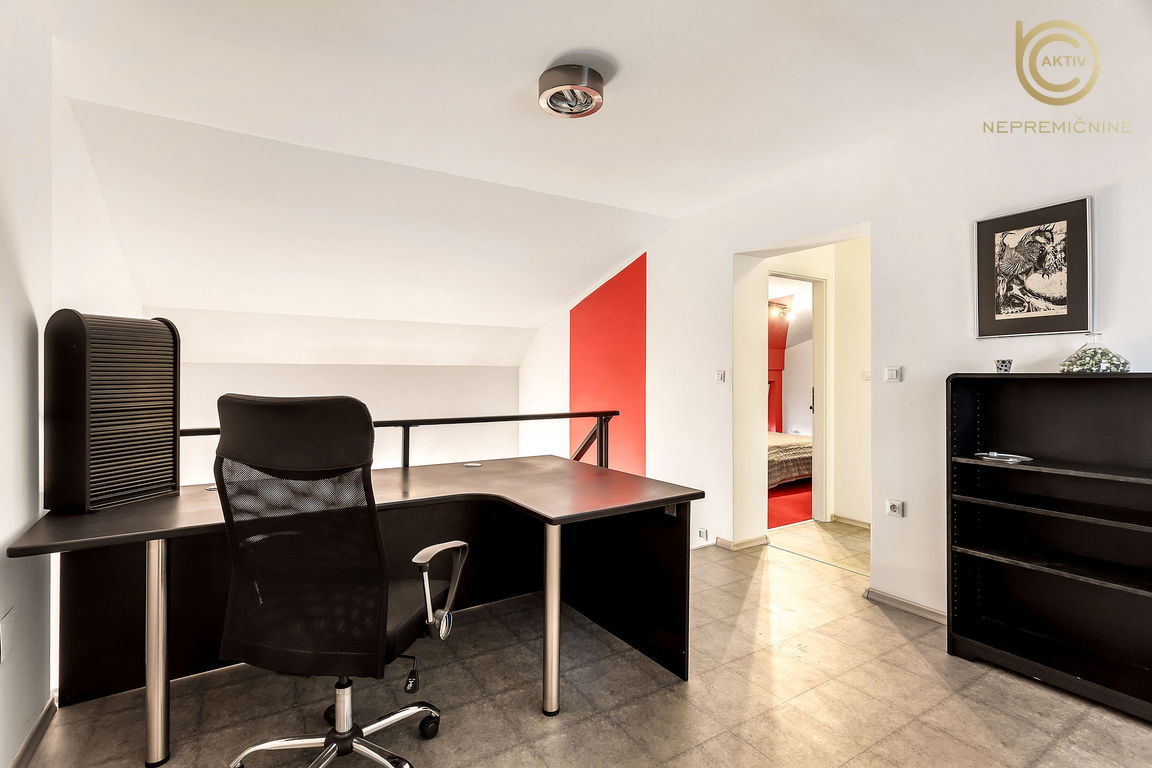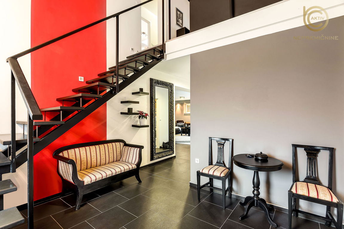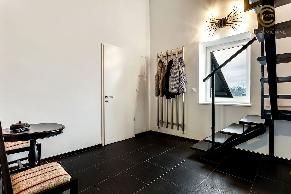 Prostori v stanovanju so razporejeni v dveh etažah (nadstropje in mansarda) z odprtim dnevno-bivalnim delom v spodnjem delu ter spalnim delom v zgornjem, pri čemer sta obe etaži med seboj povezani s kovinskim stopniščem. Lega prostorov je južna, zahodna in severna. Velika dodana vrednost sta odprt pogled na severno stran in lega nepremičnine na robu naselja, kar omogoča čudovit pogled proti Kamniško-Savinjskim Alpam in tudi zvrhano mero zasebnosti, saj stavba stoji na robu zazidljivega območja.