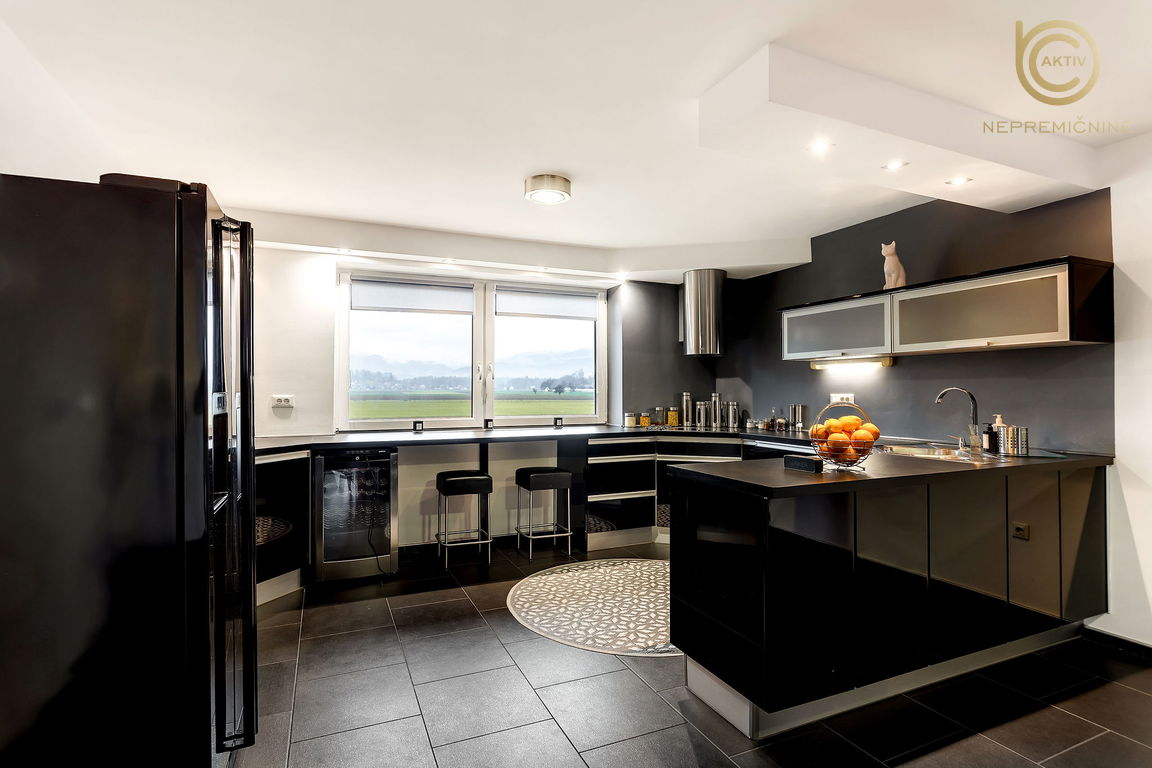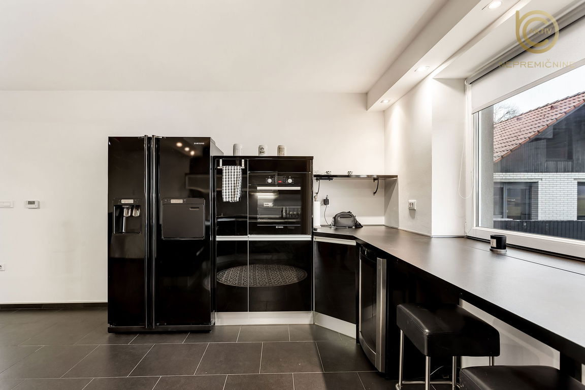 Kuhinja je opremljena s po meri izdelanim kuhinjskim pohištvom in vso pripadajočo belo tehniko (steklokeramična plošča, napa z odvodom, pomivalni stroj, pečica, ameriški hladilnik).