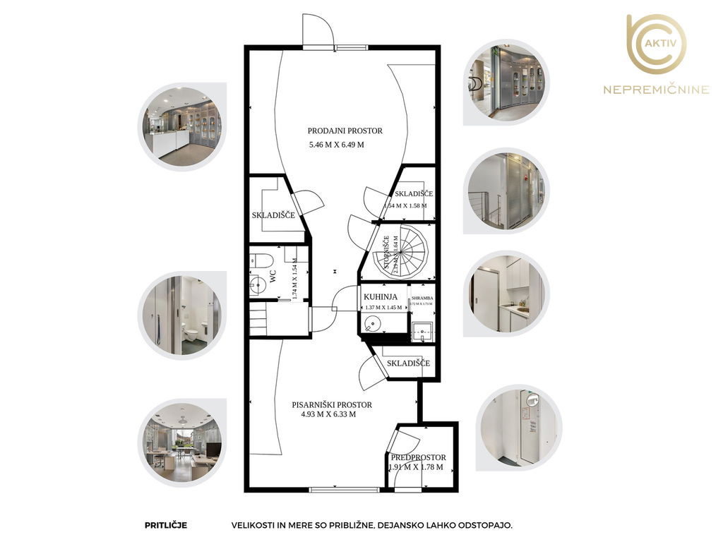 Skupna bruto površina vseh prostorov je 131,8 m2, od tega je cca 60 m2 prodajalne v pritličju.