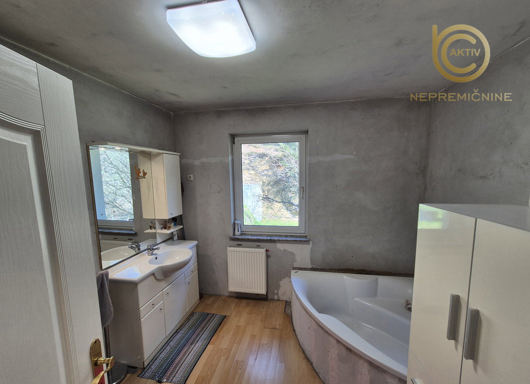 Kopalnica je opremljena s kopalno kadjo, WC-jem in umivalnikom, vendar ni dokončana. Manjkajo talne obloge in stenske obloge (keramične ploščice).