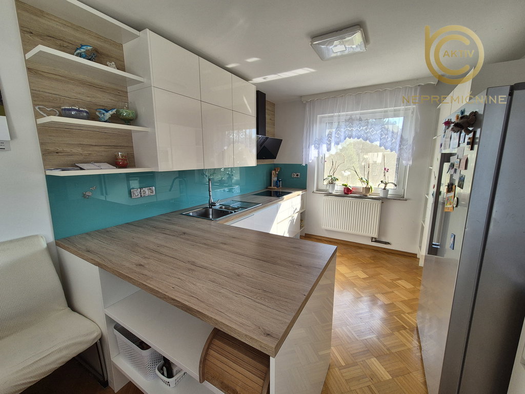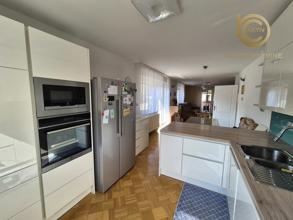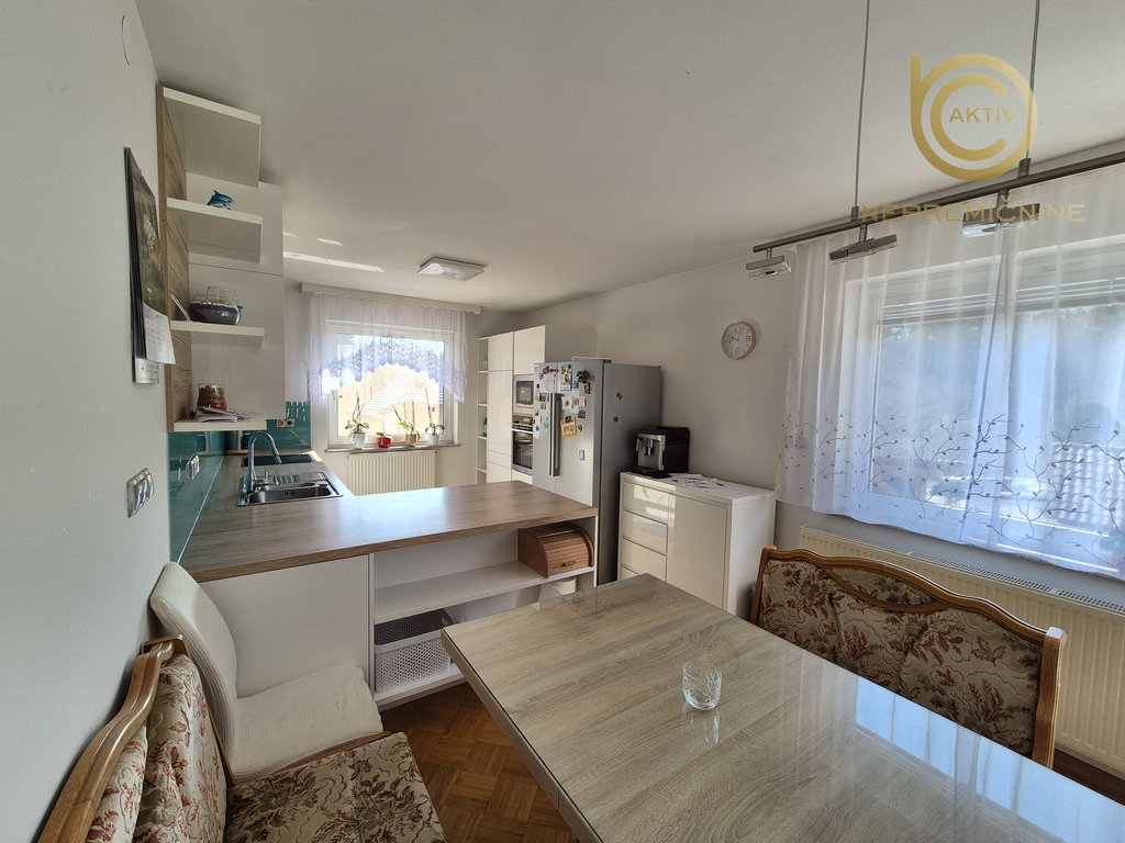 Kuhinja je bila leta 2018 obnovljena in je opremljena z vgradnim kuhinjskim pohištvom ter belo tehniko, ki vključuje steklokeramično kuhalno ploščo, pečico, napo, pomivalni stroj, mikrovalovno pečico ter samostoječi hladilnik z zamrzovalnikom. Jedilni del dopolnjuje jedilna miza s klopjo in jedilnimi stoli.
