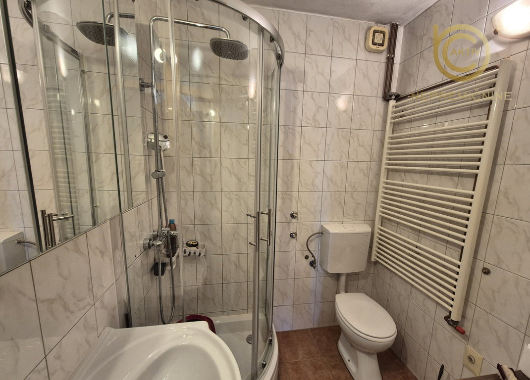 Kopalnica vključuje kabino za prhanje, WC, umivalnik ter omaro z ogledalom.