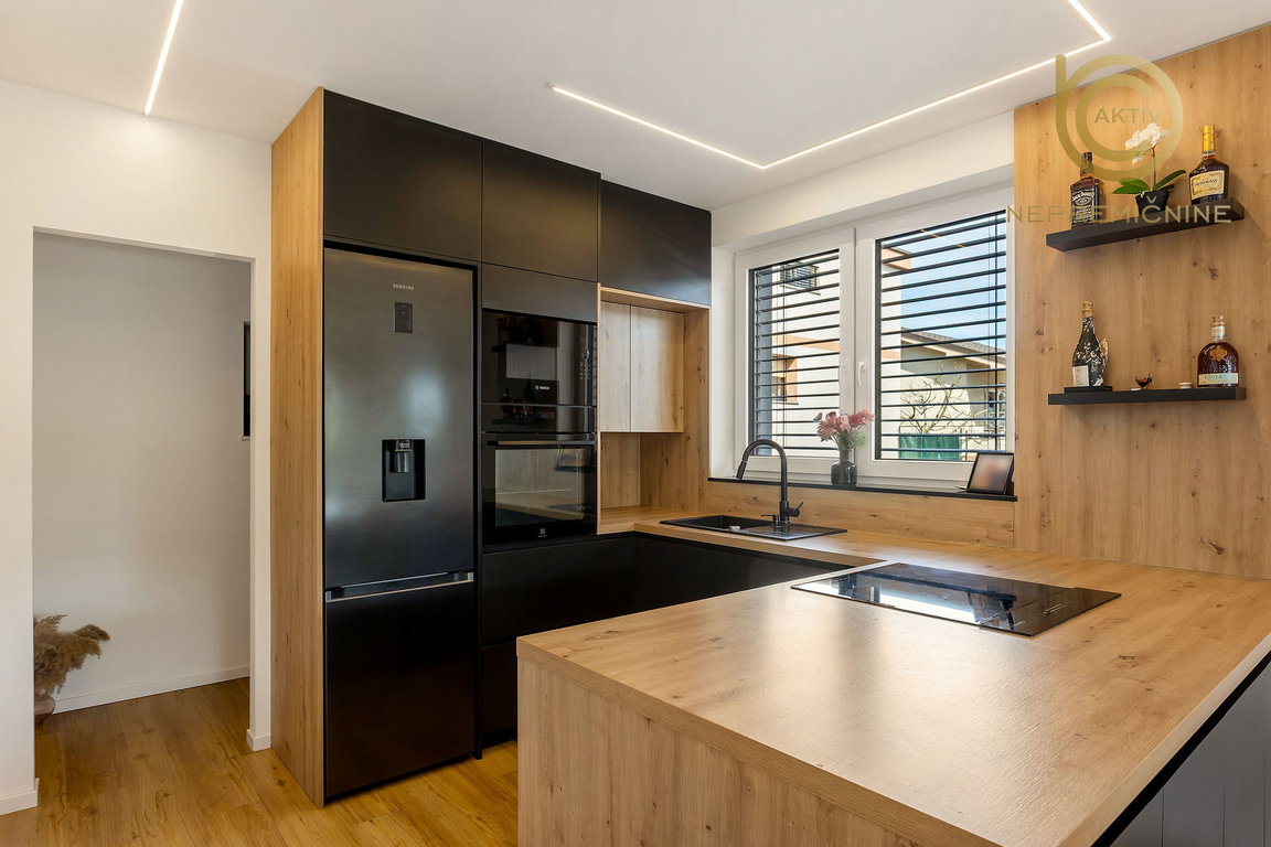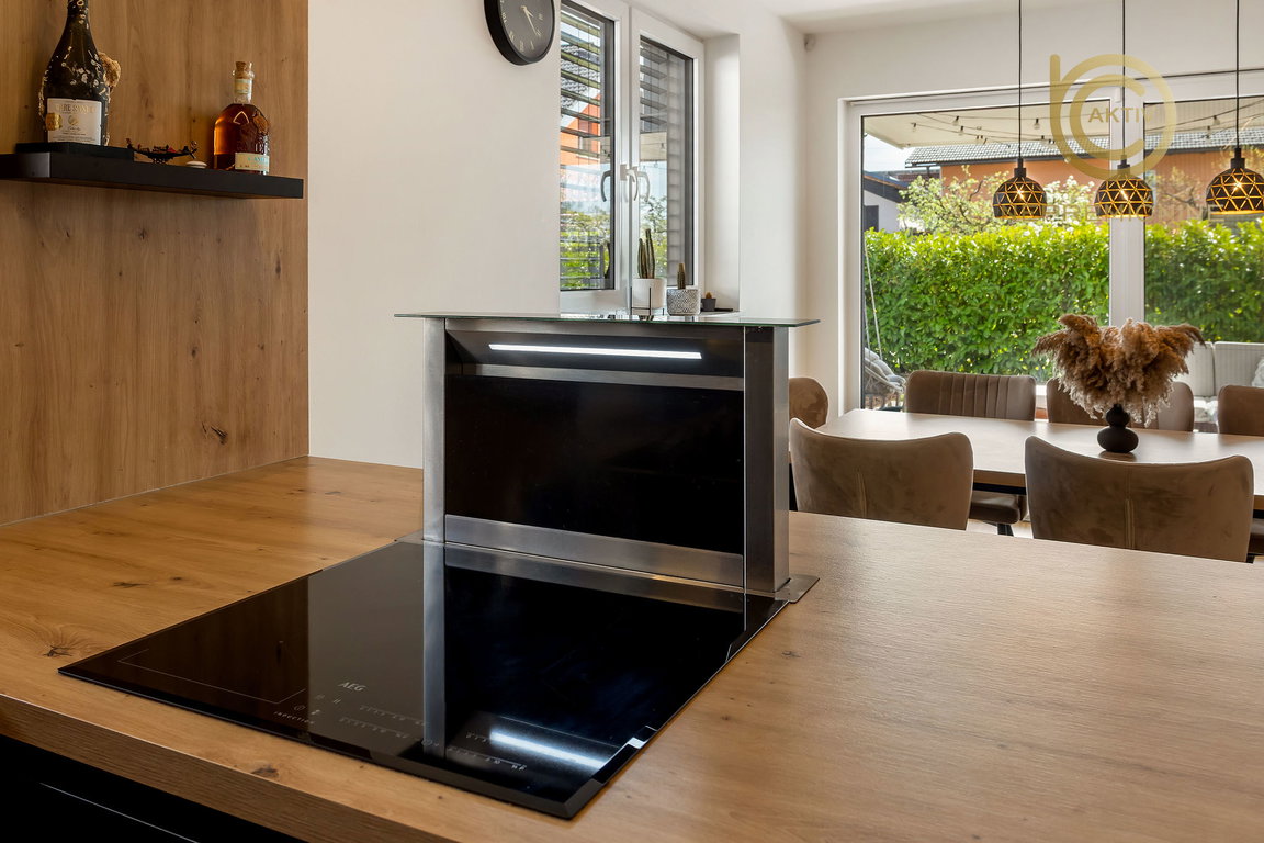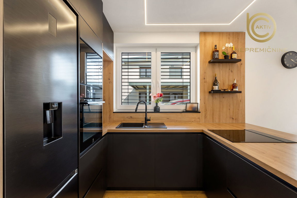 Kuhinja je opremljena z najsodobnejšo belo tehniko in pohištvom. Vgrajeni so: indukcijska kuhalna plošča s potopno napo, pečica s pirolizo, mikrovalovna pečica in pomivalni stroj, v kuhinji pa stoji tudi hladilnik z zamrzovalnikom.