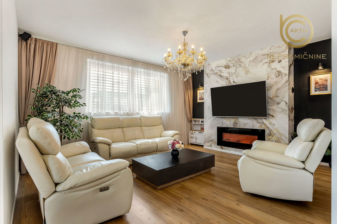 Dnevna soba je opremljena z električno sedežno garnituro (trosedom, dvosedom in počivalnikom) z raztegljivim naslonom, klubsko mizico in električnim kaminom.