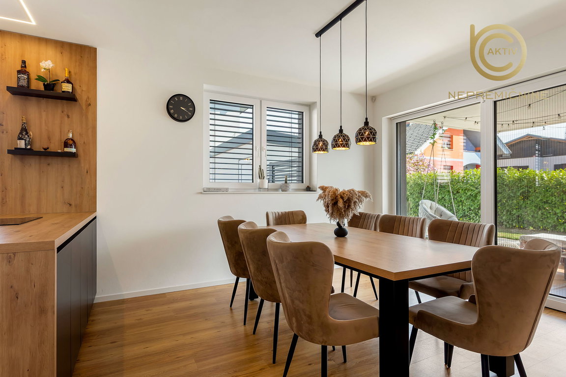 V jedilnici je velika, po meri izdelana jedilna miza z osmimi oblazinjenimi stoli.