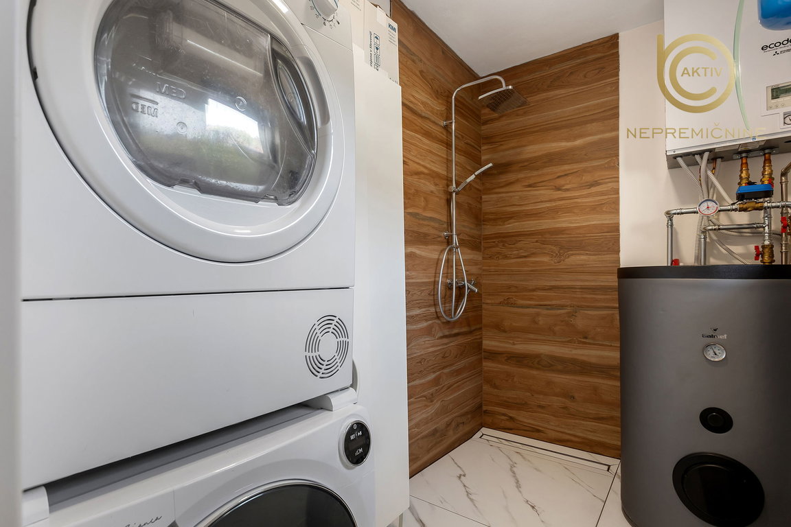 Utility je opremljen s kabino za prhanje, notranjo enoto toplotne črpalke, pralnim in sušilnim strojem.