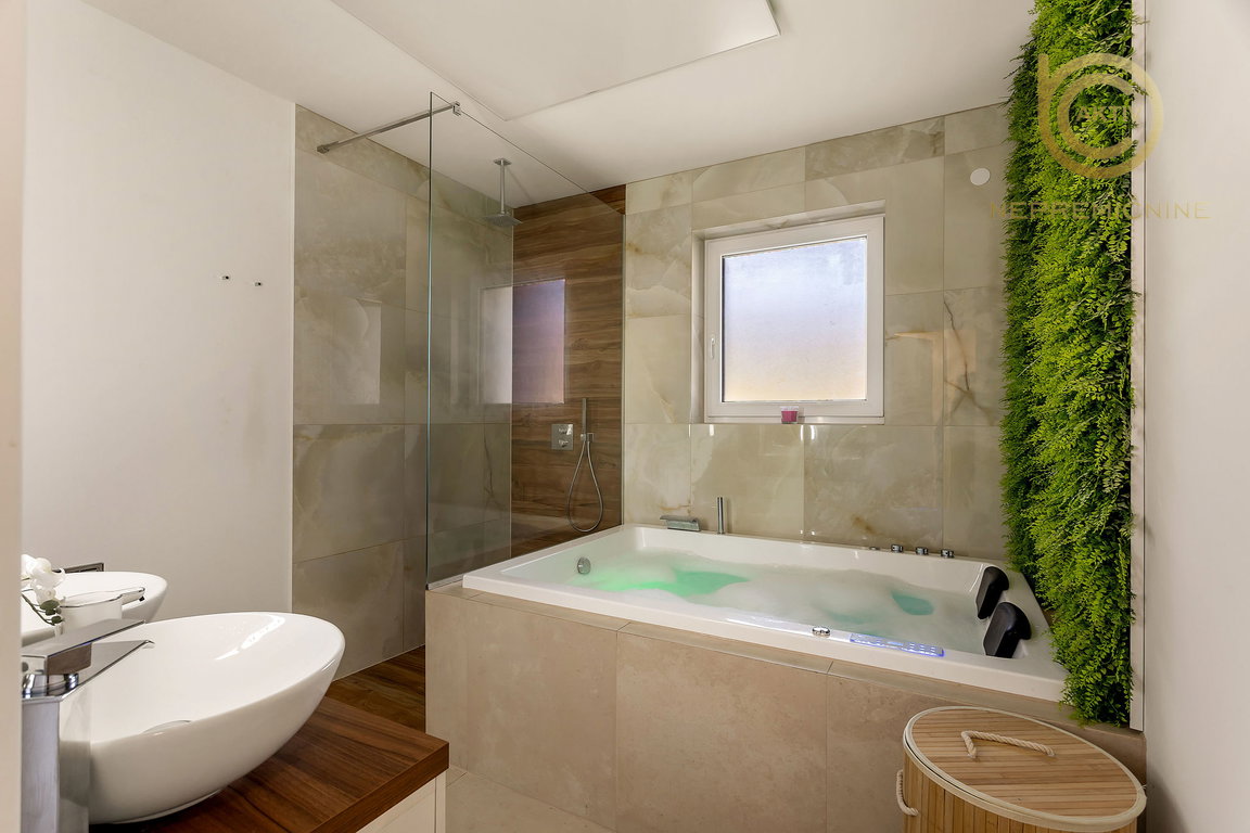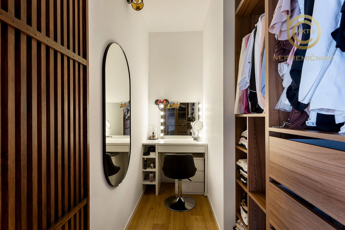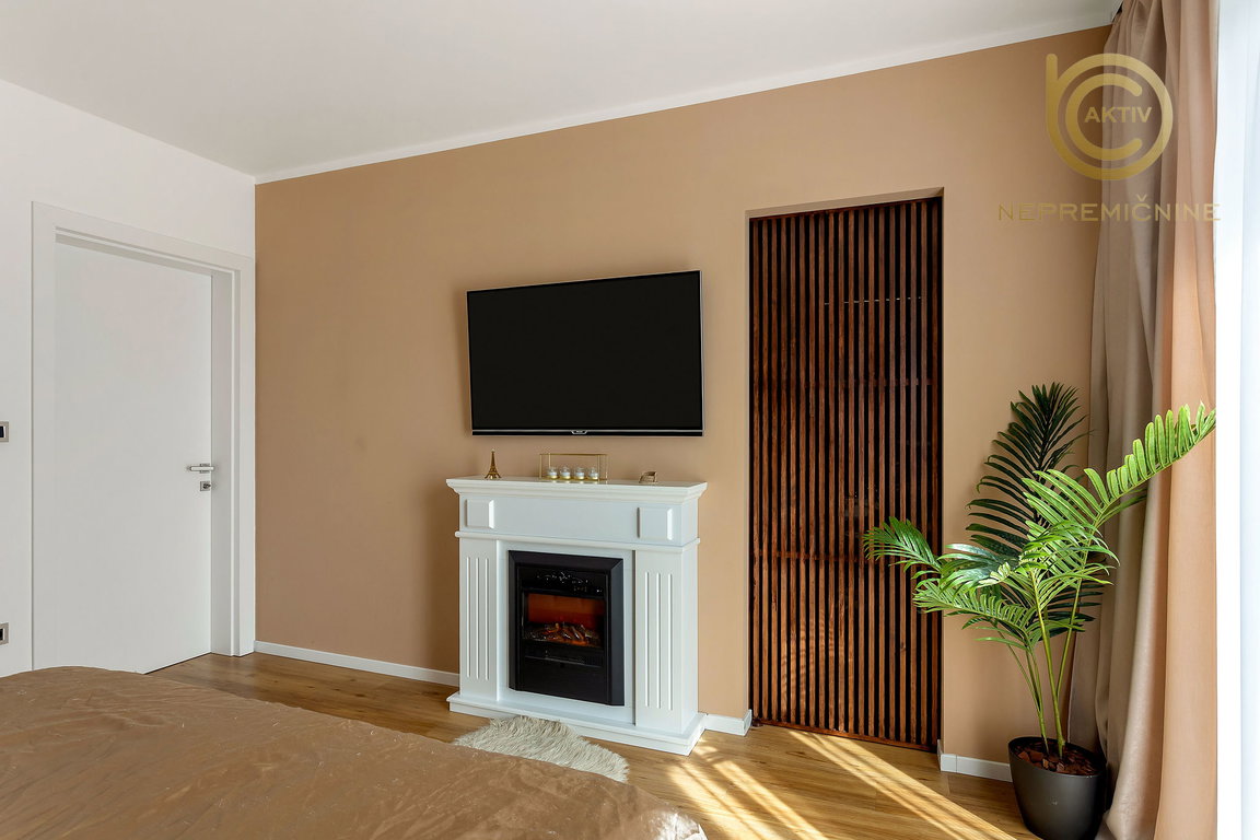 Glavna spalnica je opremljena z zakonsko posteljo, dvema nočnima omaricama in električnim kaminom. V garderobi so po meri izdelane omare in police.