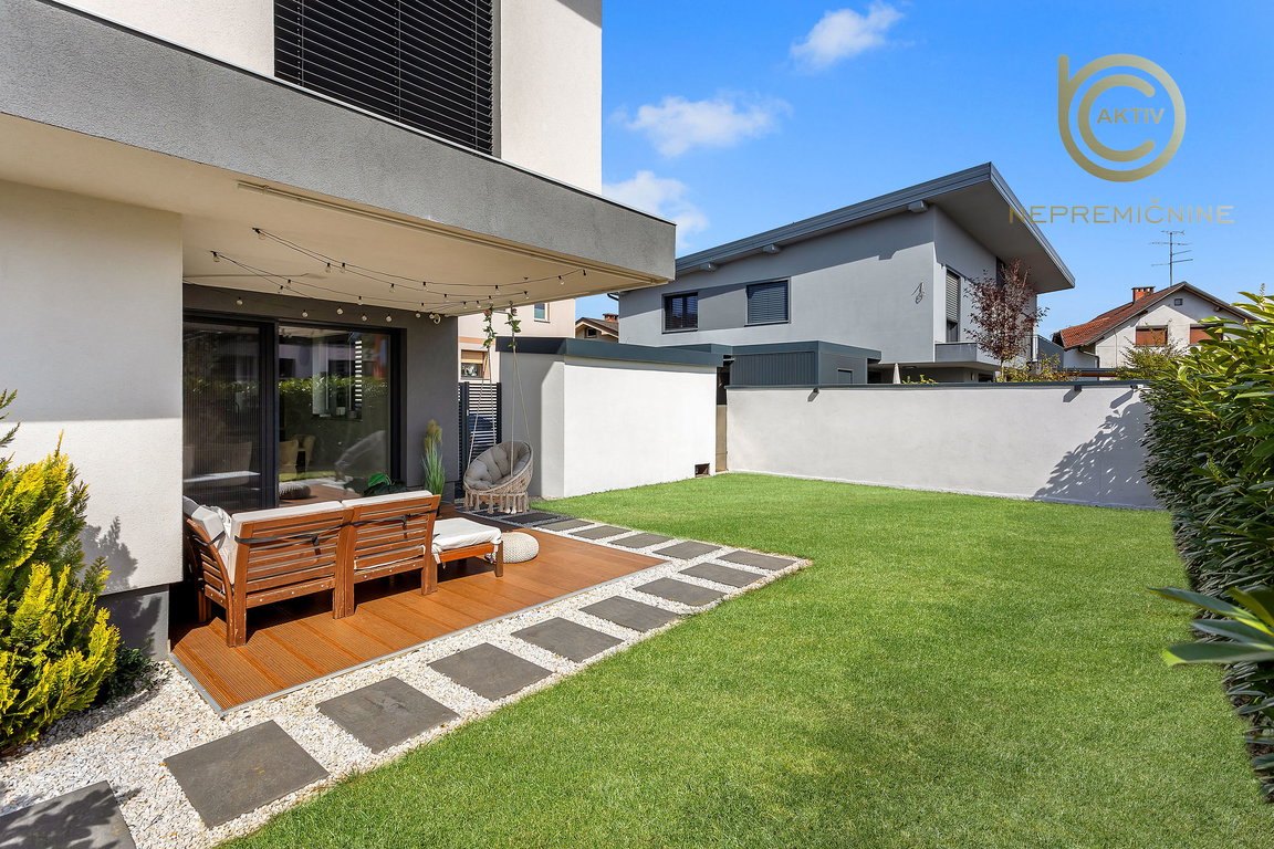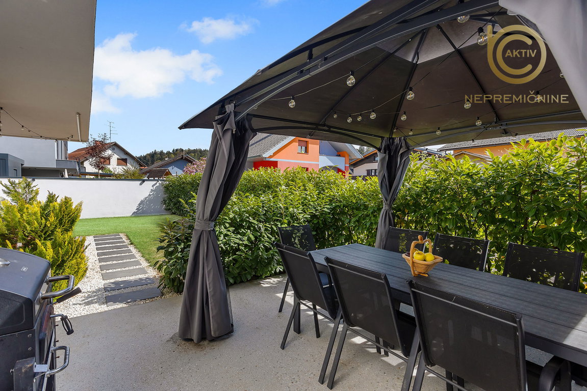 Atrij velikosti približno 133 m2, ki je v celoti ograjen in orientiran južno, nudi zvrhano mero zasebnosti in omogoča kvalitetno preživljanje prostega časa. V atriju je zasajena okrasna zelenica z samodejnim sistemom zalivanja in košenja. Na prehodu iz dnevno-bivalnega dela v atrij so nameščena velika panoramska okna, preko katerih dostopamo do prostorne pokrite terase.