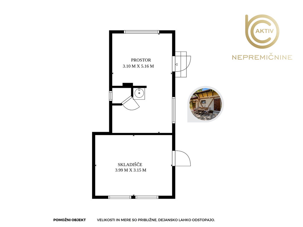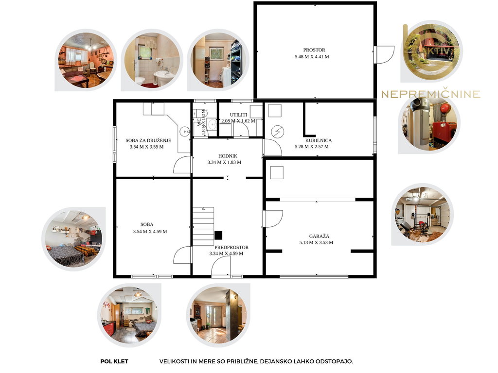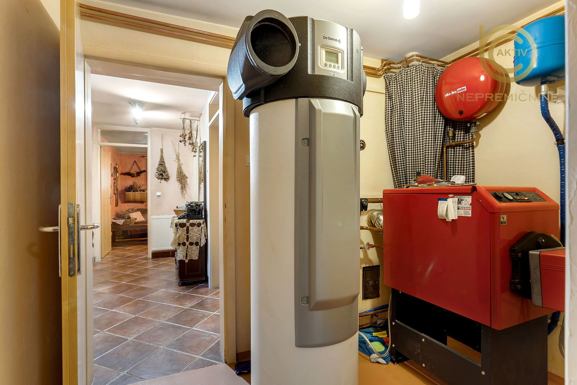 • tehnična soba, v kateri so peč na kurilno olje, cisterna in toplotna črpalka za ogrevanje vode (zamenjana leta 2021)
