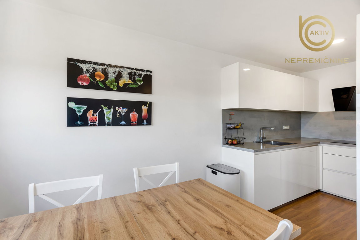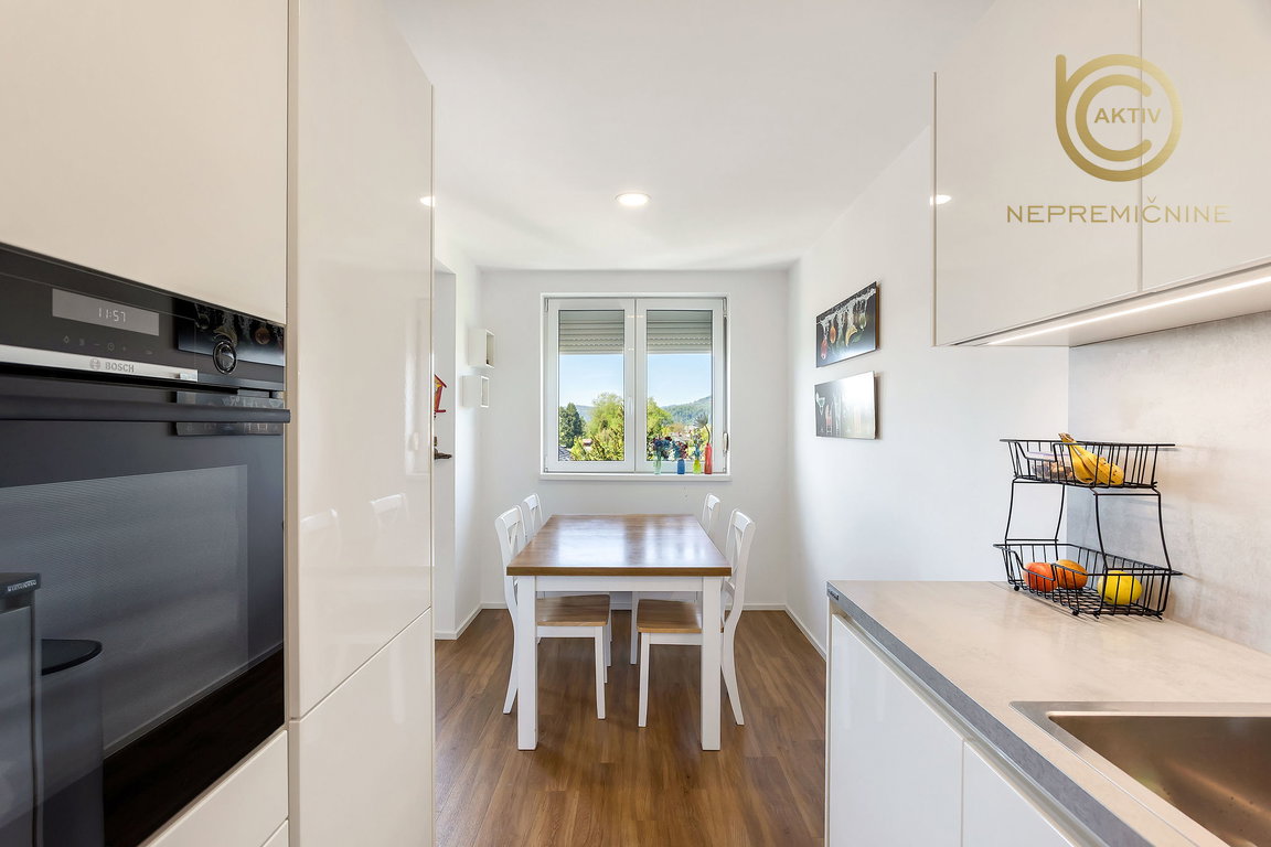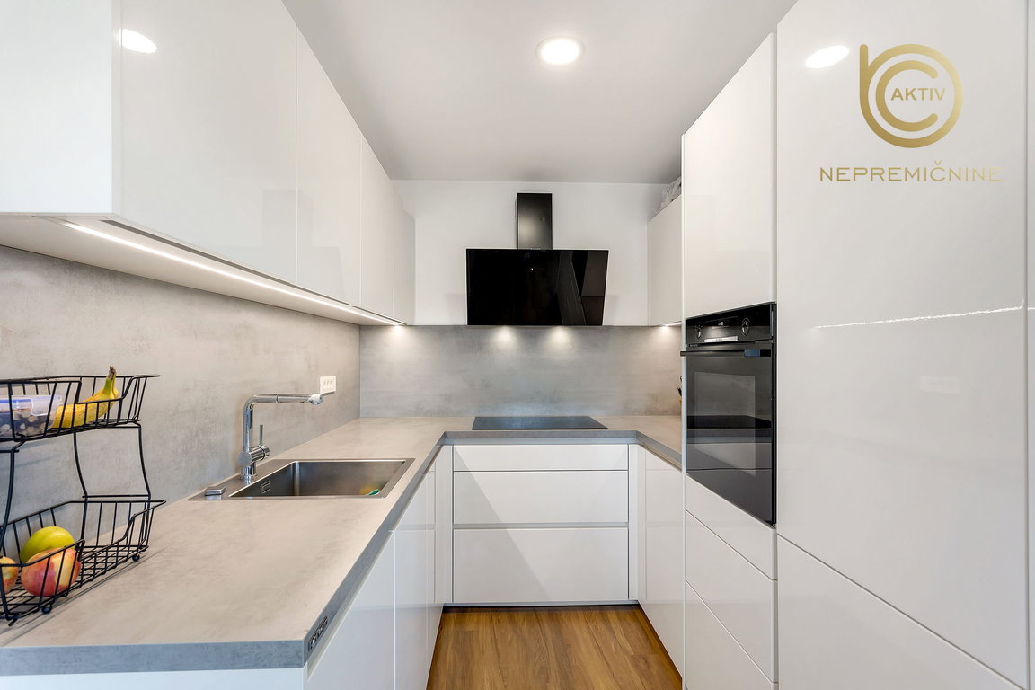 Kuhinja je opremljena s po meri izdelanim pohištvom DanKüchen z veliko delovne površine. Bela tehnika: hladilnik z zamrzovalnikom (Bosch), pomivalni stroj (Bosch), indukcijska kuhalna plošča (AEG), pralni stroj (Bosch) in napa (Faber). Hladilnik in pralni stroj sta bila kupljena letos in sta še v garanciji.