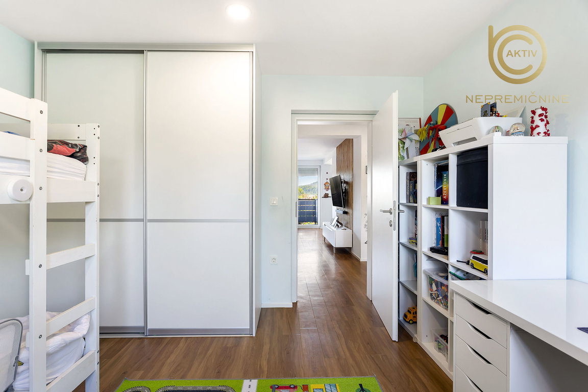 Otroška soba je opremljena s pogradom, vgradno garderobno omaro in pisalno mizo.