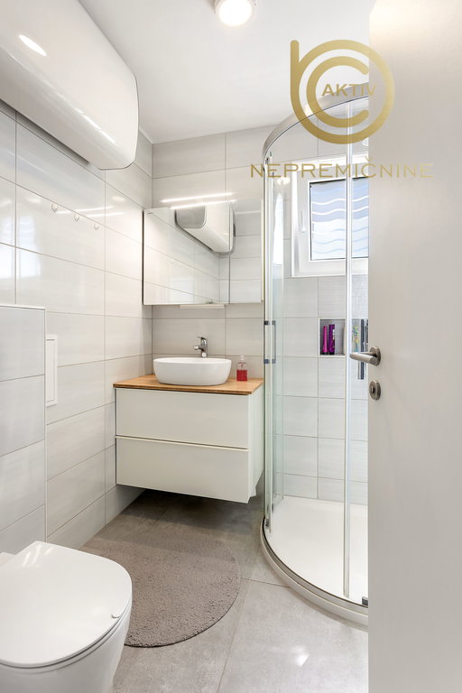 V kopalnici so kabina za prhanje, umivalnik z ogledalom in omarico ter WC školjka.